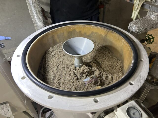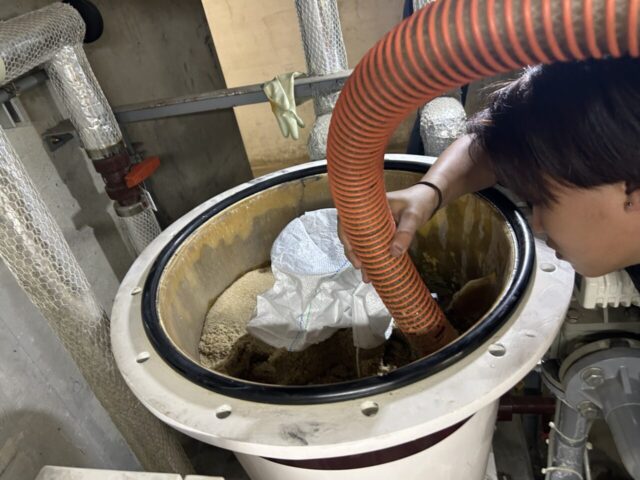 バキュームでろ材を排出します。