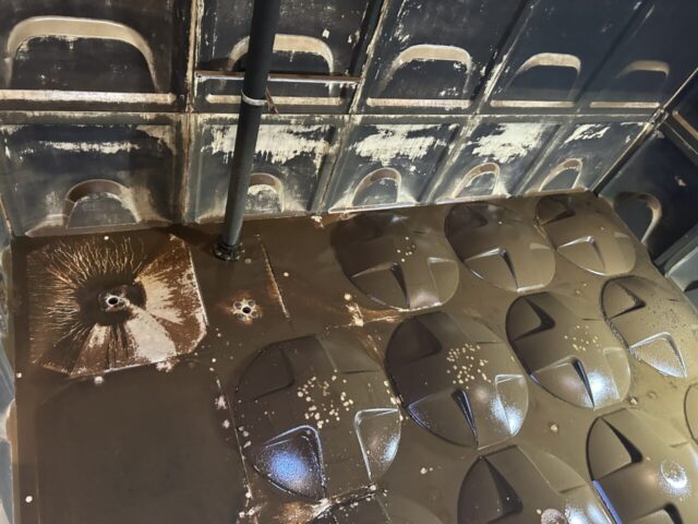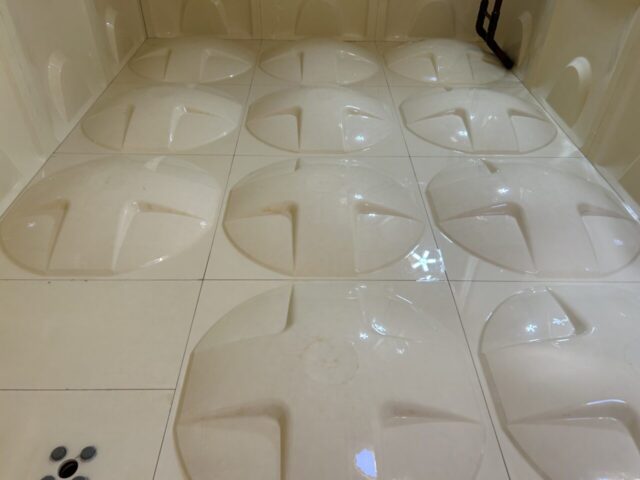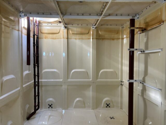 こちらの温泉タンクは、泉質によってマンガン・カルシウム由来の黒い温泉スケールが付着します。