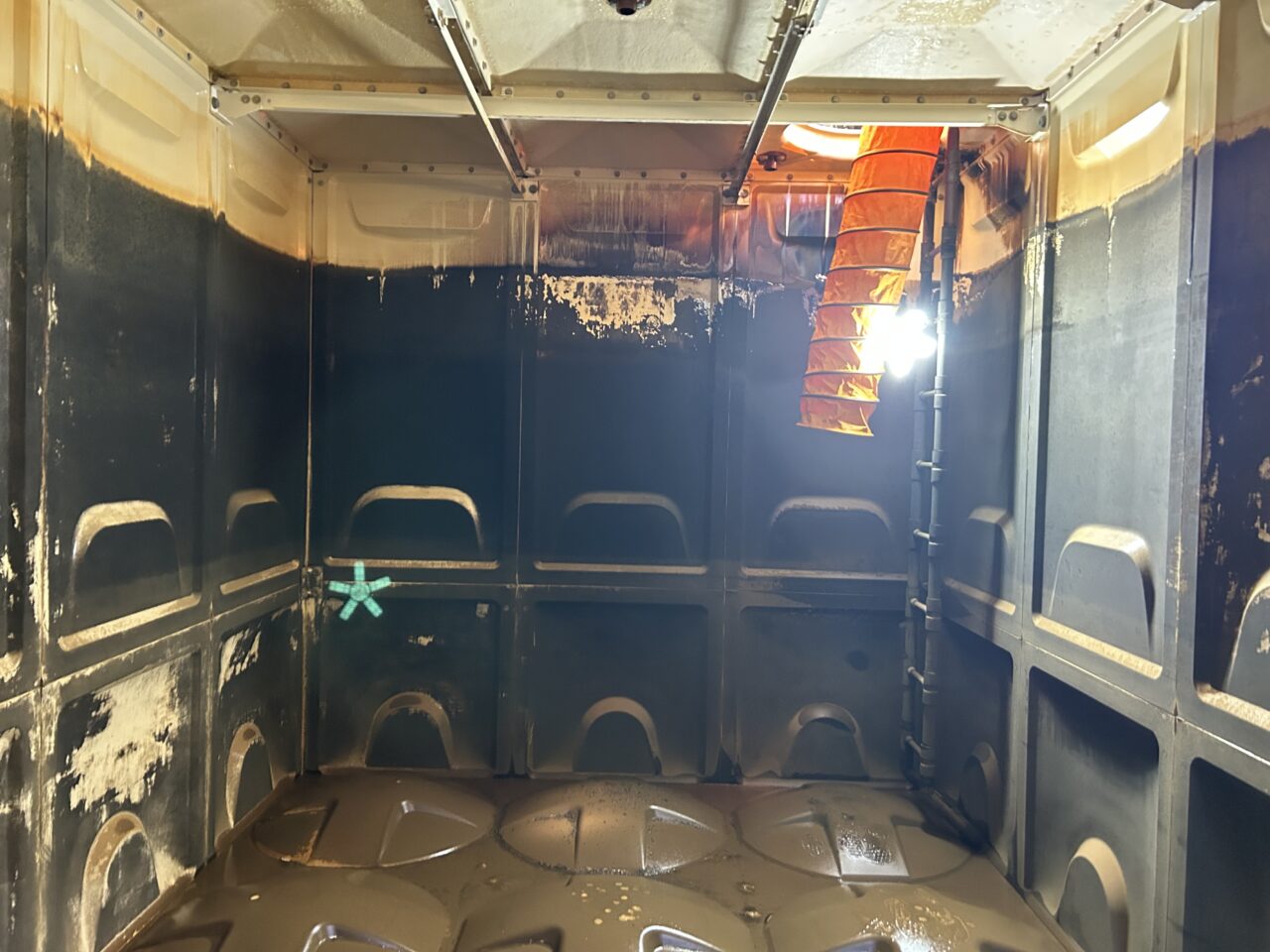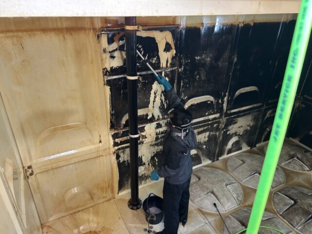 床は汚泥状のスケールなので洗い流せますが壁面は固着しているので高圧洗浄では全く落ちません。